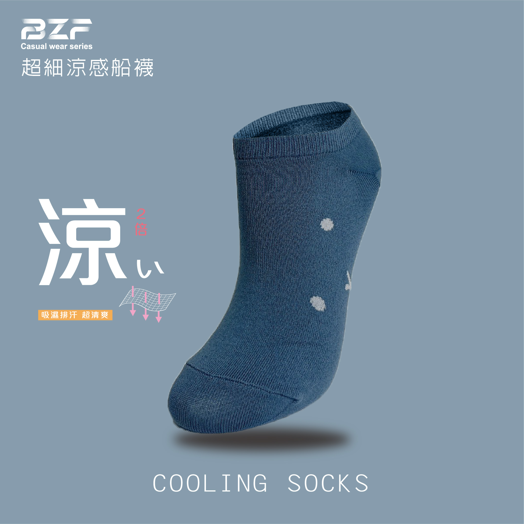 使用涼感纖維,添加清涼節能粉體利用其吸熱慢,散熱快之特性吸濕排汗,穿著者散熱舒爽立體腳跟織法,穩定腳跟位置超細纖維編織,透氣舒適貼合 清涼 / 透氣 / 船襪