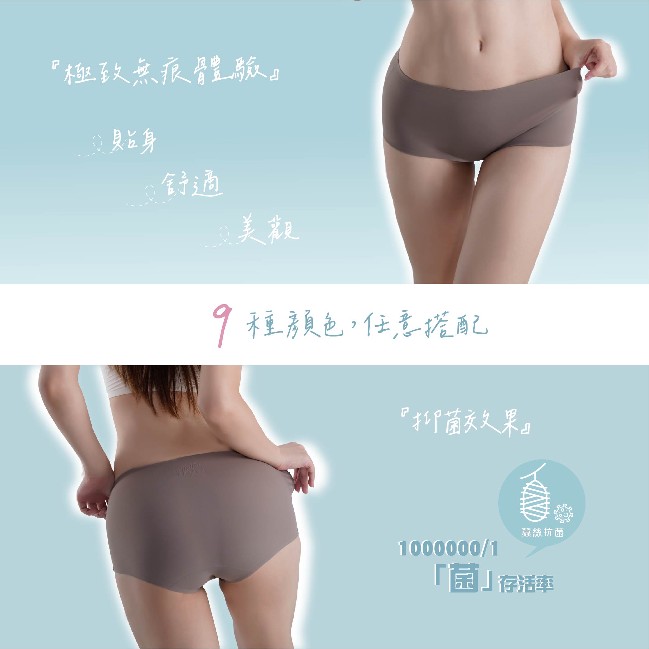 高級尼龍材質,觸感柔滑,輕薄舒適褲身彈性加強,完美貼身、平整細緻採三邊無痕黏合加強,穿著不留痕跡褲頭 / 褲管包覆收邊,防止捲邊夾臀蠶絲嫘縈抗菌纖維褲襠,抑菌率 > 99.99全方面保護私密處