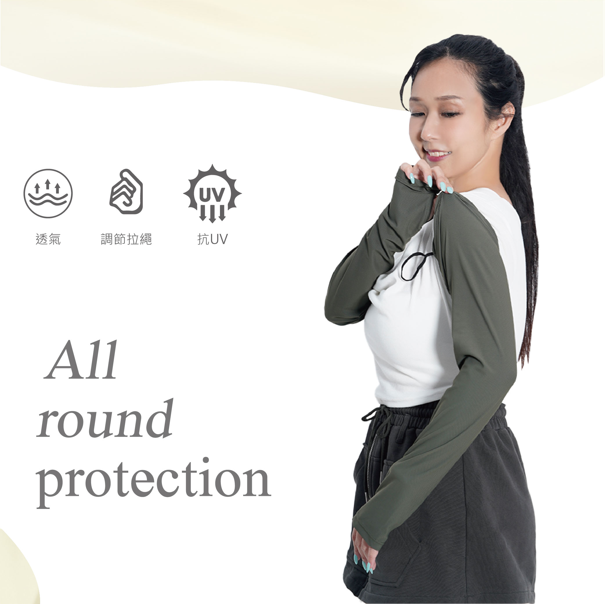 雙材質拼接,內側新材質吸排網眼布,透氣舒適台灣設計,反光Logo設計,夜間行走更安全冰絲材質,讓肌膚體驗冰涼清爽的感覺手袖套兩用設計,防護更全面伸展性優活動自如,親膚不悶熱防曬、抗UV、有效阻隔紫外線柔細舒適不緊繃,男女都適合