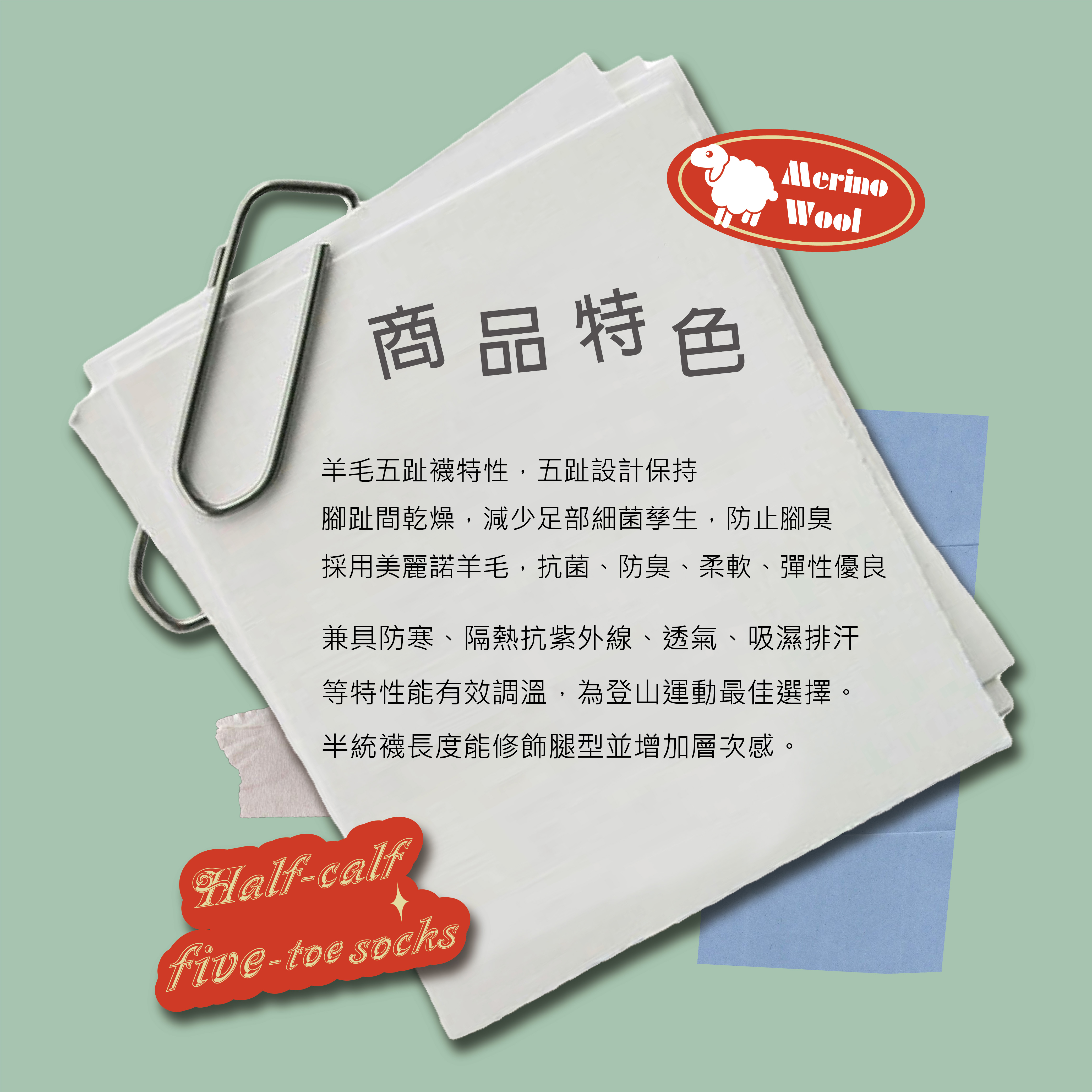 羊毛五趾襪特性,五趾設計保持腳趾間乾燥,減少足部細菌孳生,防止腳臭採用美麗諾羊毛,抗菌、防臭、柔軟、彈性優良兼具防寒、隔熱抗紫外線、透氣、吸濕排汗等特性能有效調溫,為登山運動最佳選擇。半統襪長度能修飾腿型並增加層次感。