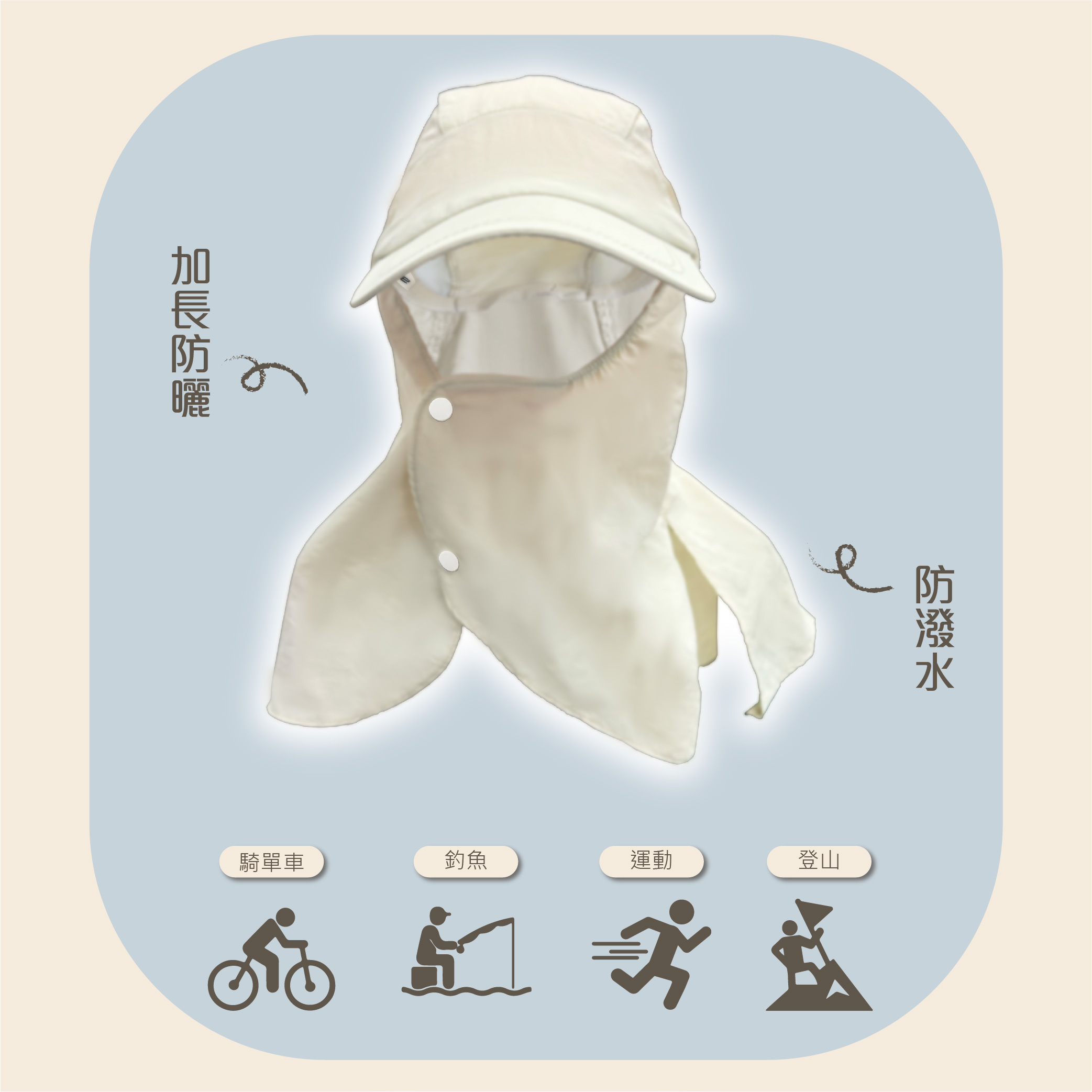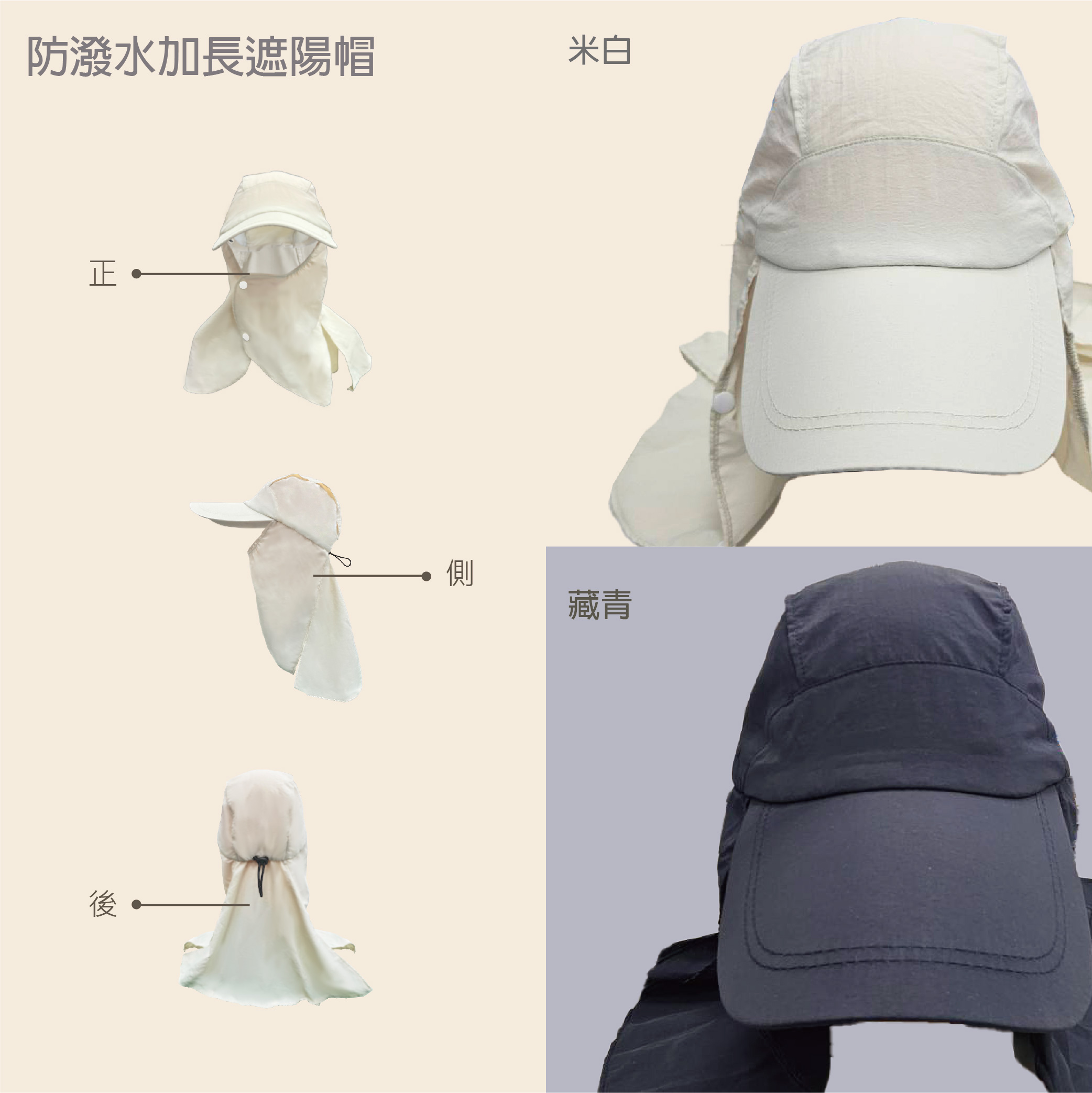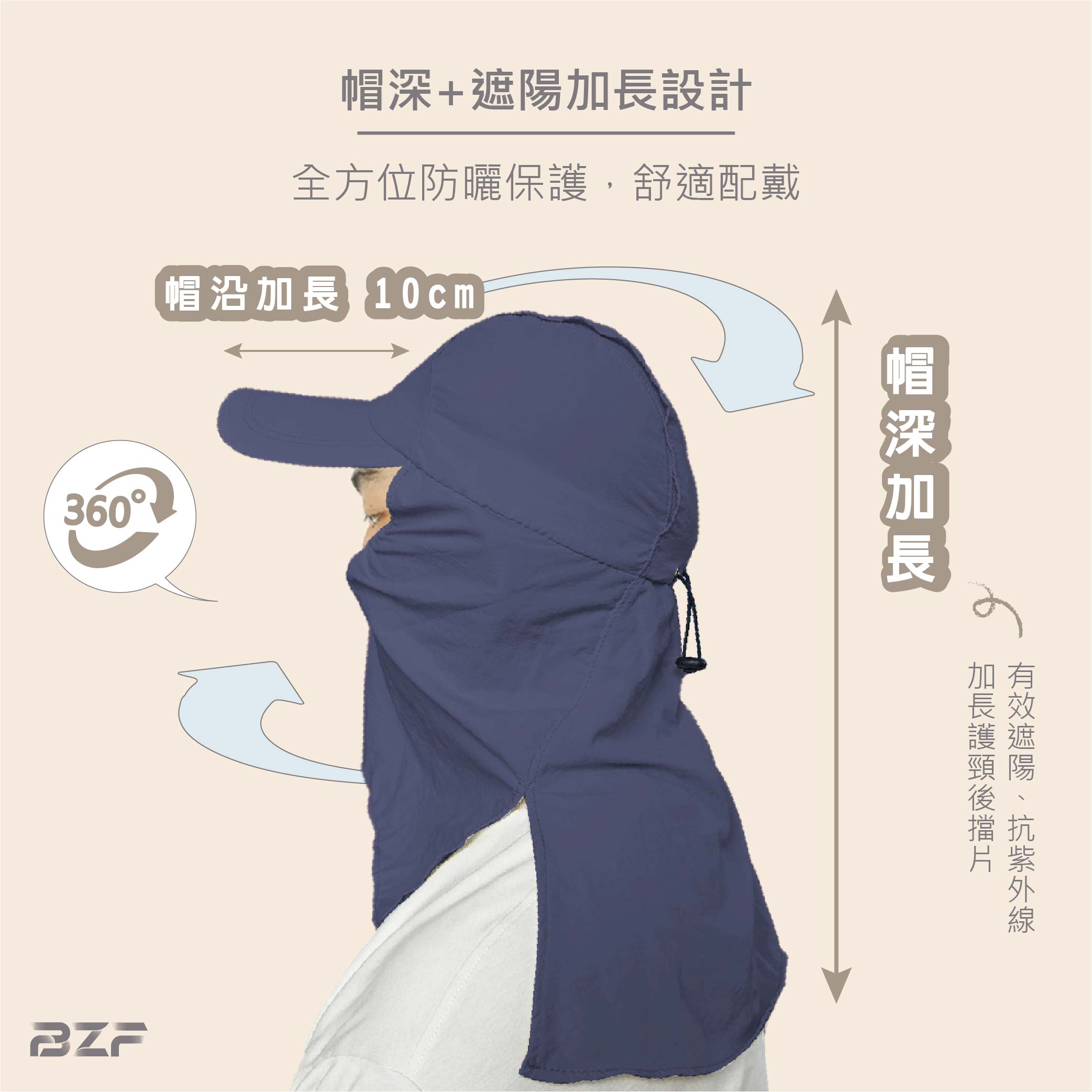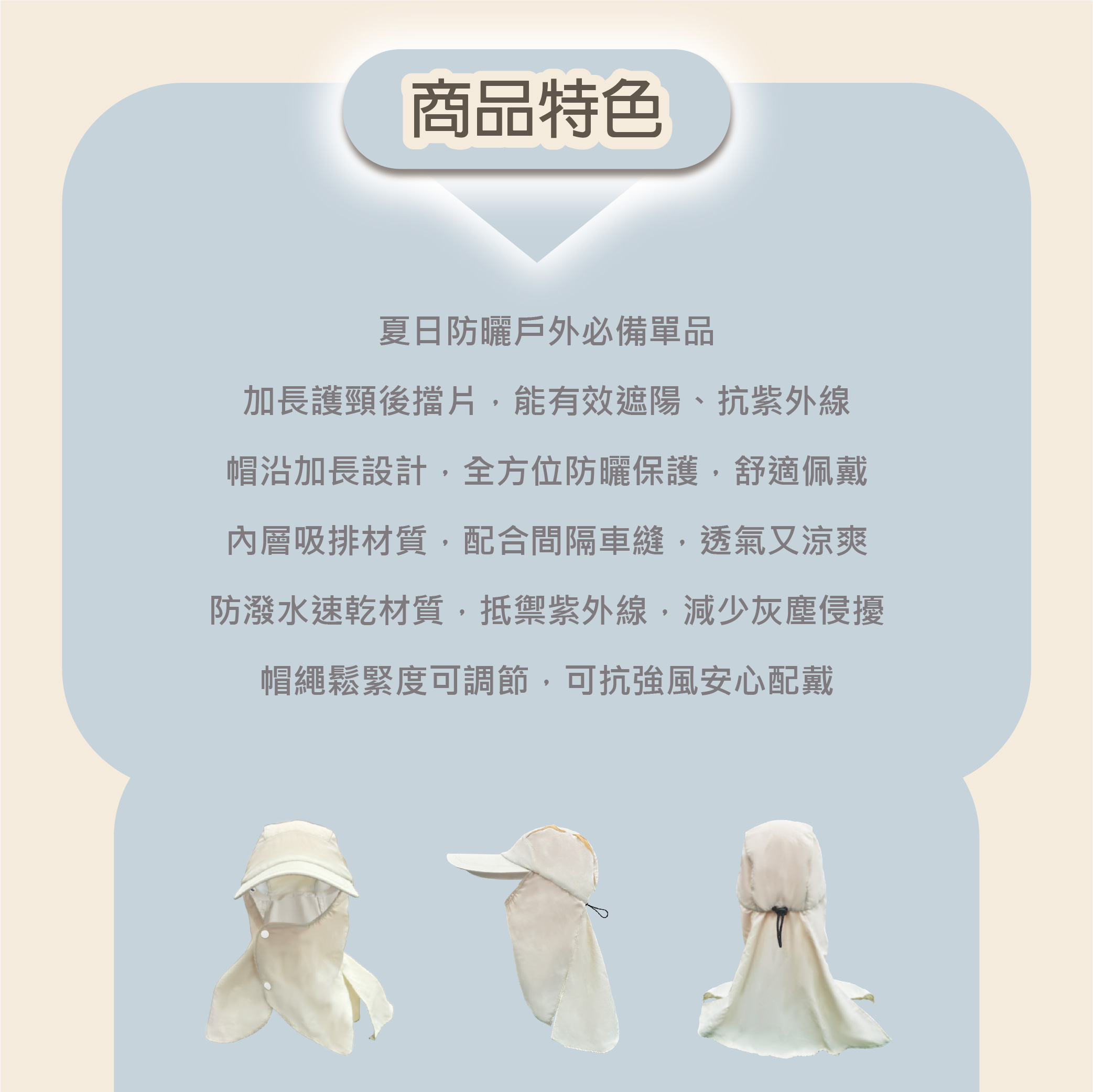 夏日防曬戶外必備單品加長護頸後擋片,能有效遮陽、抗紫外線帽沿加長設計,全方位防曬保護,舒適佩戴後端高開口設計,涼爽通風,更可適用紮馬尾群族護頸後擋片可拆卸設計,一帽兩用實用性翻倍防潑水速乾材質,抵禦紫外線,減少灰塵侵擾帽圍鬆緊調節,可抗強風安心配戴防潑水速乾材質,抵禦紫外線,減少灰塵侵擾