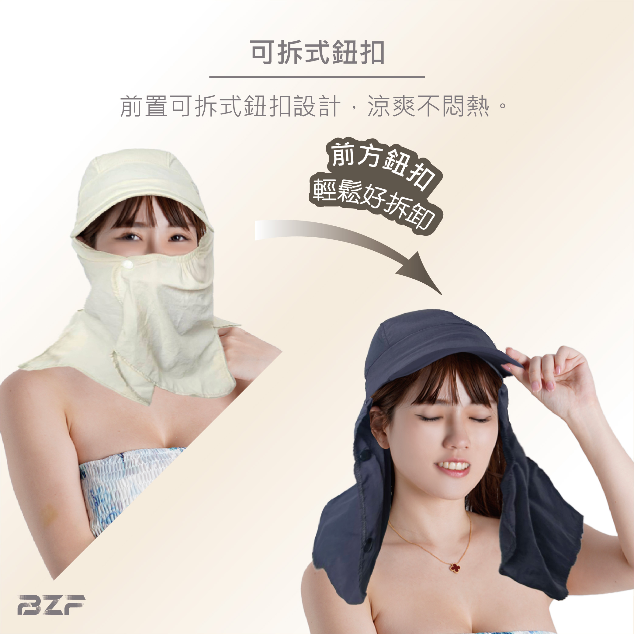 夏日防曬戶外必備單品空頂設計,涼爽通風,更可適用紮馬尾群族面罩和護頸後擋均可拆卸,組合多種佩戴方式,滿足不同需求口鼻透氣孔設計,呼吸無阻擋帽繩鬆緊度可調節,可抗強風安心配戴全方位防曬保護,舒適佩戴防潑水速乾材質,抵禦紫外線,減少灰塵侵擾
