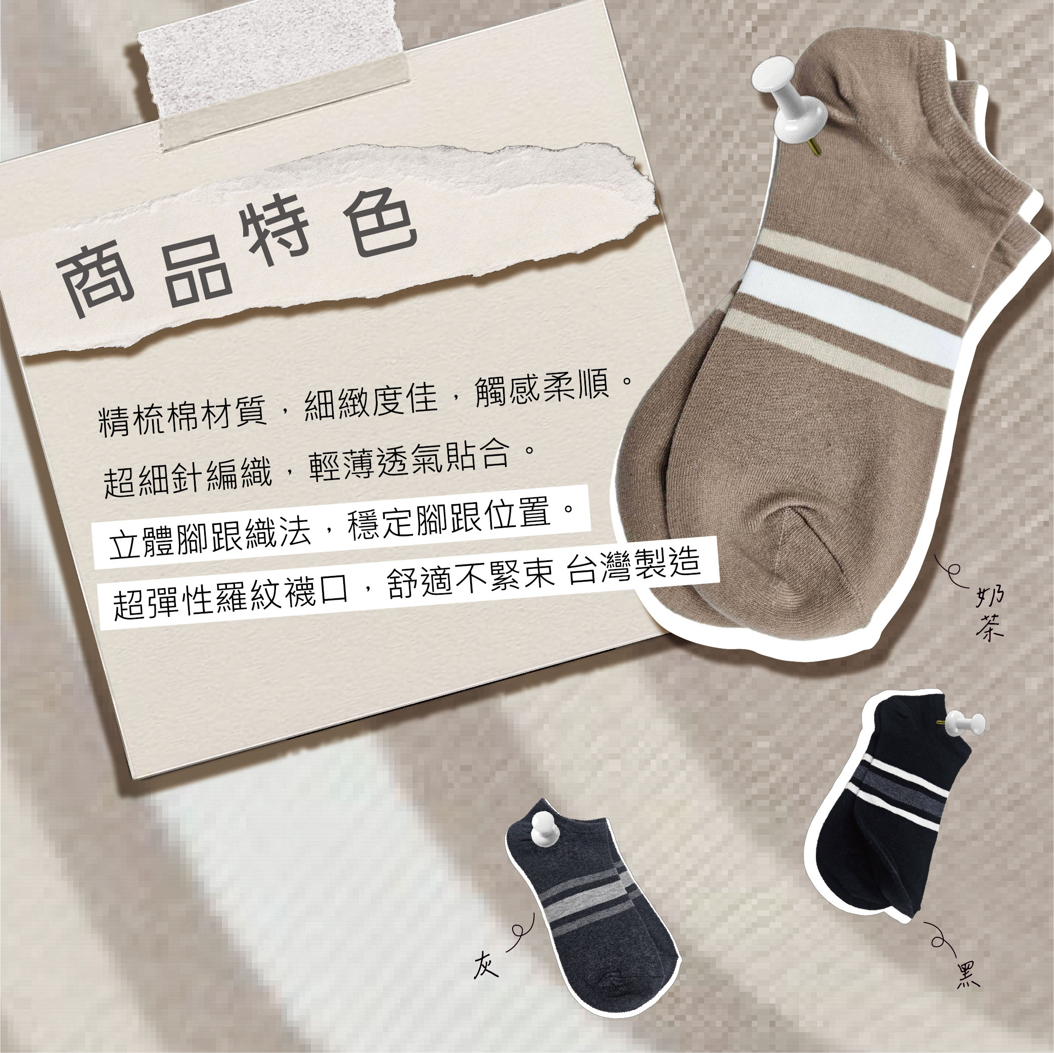 腳趾自動對目無縫縫合機台,減去與腳趾摩擦造成不適與疼痛, 選用優質消臭紗,經TTRI檢測,具消臭率100%功效, 精梳棉材質,細緻度佳,觸感柔順,台灣製